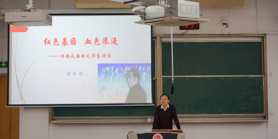 胡學(xué)琦以毛澤東詩(shī)詞為線索,從毛澤東與詩(shī)詞、革命歷程、精神心路與美學(xué)特征四方面展開(kāi),生動(dòng)解讀詩(shī)詞背后的黨史與革命情懷;他帶領(lǐng)同學(xué)們回顧從“誰(shuí)主沉浮”的豪情到“星火燎原”的膽識(shí),展現(xiàn)了毛澤東詩(shī)詞作為“詩(shī)化黨史”的深刻內(nèi)涵,并剖析其中蘊(yùn)含的崇高精神與人文哲思。講座尾聲,胡學(xué)琦引用“數(shù)風(fēng)流人物,還看今朝”,鼓勵(lì)同學(xué)們傳承紅色精神,勇?lián)鷷r(shí)代使命。